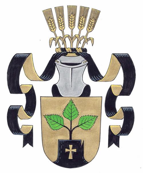Kultakilvellä tyvestä työntyvä puunkanto, josta kasvaa kolmihaarainen ja kolmilehtinen koivunoksa. Kanto ja oksa mustat, lehdet vihreät, kannossa kultainen yrjönristin tavoin levenevä latinalainen risti. Pistokypärä: kypäräpeite musta, vuoripuoli kultaa, lakipunos kultaa ja mustaa. Kypärän koristeena 4 kultaista tähkää varsineen ja lehtineen.